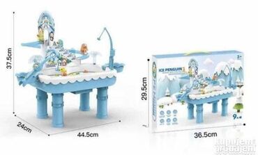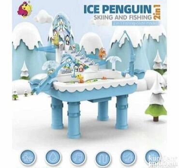 Krivudava skijaška staza za pingvina koji skija kao pravi 🏔️. U dnu staze nalazi se bazen 🌊. Dodajte vode za interesantniju zabavu, a 9 prelepih ribica mogu da plivaju 🐟.