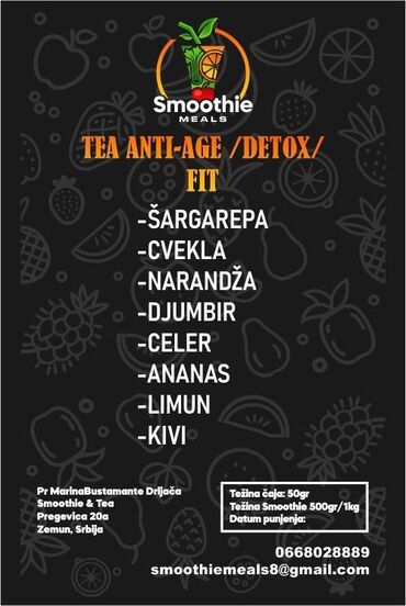 Proizvođač: Pr Marina Bustamante Drljača, Smoothie & Tea, Prekrevica 20a, Zemun, Srbija