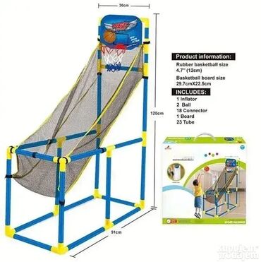 🛠️ Konstrukcija je napravljena praktično, od cevastih plastičnih materijala koji se lako sklapaju i formiraju konstrukciju za košarku sa mrežicom koja skuplja lopte.