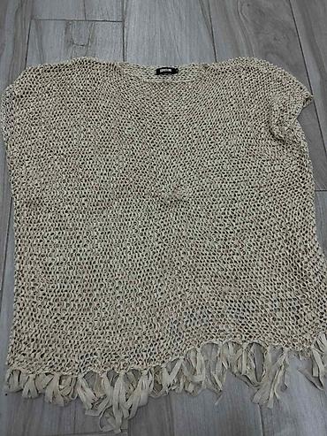 Elegantna ženska pelerina/pončo od toplog, mekano-teksturisanog materijala u bež boji. Model je A-kroja sa širokim, talasastim faldama i kratkim, stajaćim kragnom. Kopčanje napred na tri dekorativn...