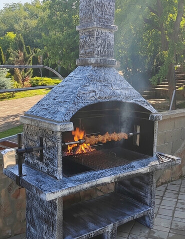 - Masivna spoljašnja pečenjara od livenog betona/veštačkog kamena, sa teksturom kamena i visokim dimnjakom za efikasno odvođenje dima.