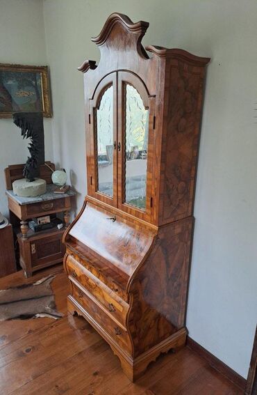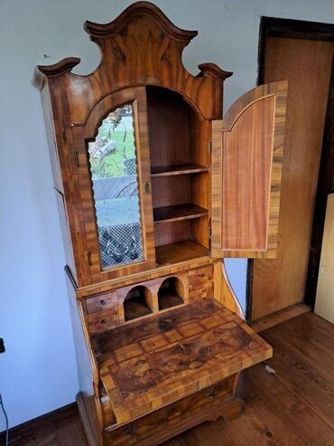 UpotrebljenоStari, izuzetan komad namestaja, uradjen od debelog maslinovog furnira. Gornji deo ima peskirano ogledalo. Donji deo ima sekreter i 3 fioke. Tabernakl je u odlicnom stanju. Visina je 190cm, dubina gornjeg dela je 26cm a dubina fioka je 47cm. Visina radne ploce sekretera 63cm.