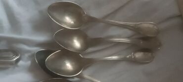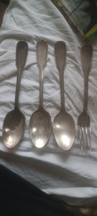 - U kompletu se vide: velike kašike (više komada) i jedna viljuška sa tri zupca; dodatno nekoliko manjih/čajnih kašika