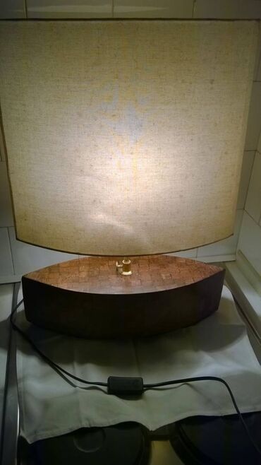 UpotrebljenоStona lampa na drvenom postolju visina 46, sirina 40 cm, E 27 grlo.Malo naborana plasticna podloga,bez sijalice.