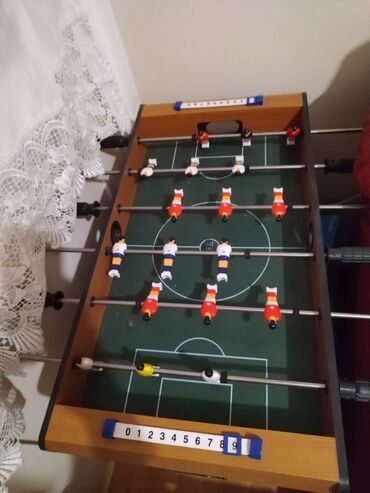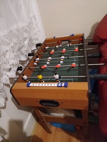 Stoni fudbal – kompaktni model sa drvenim kućištem i nogarama, idealan za kuću ili dečiju sobu. Dimenzije 66cm visina, 68,5cm duzina i sirina 37cm.