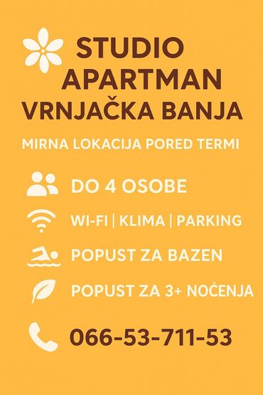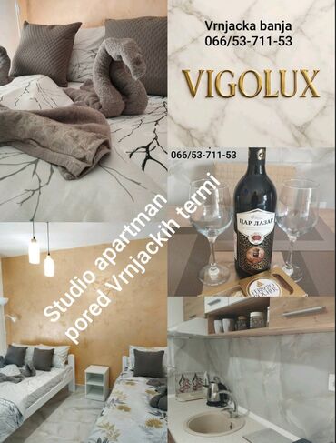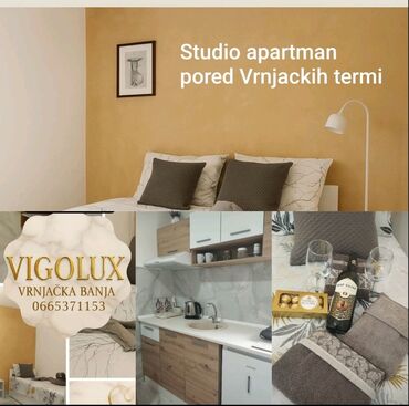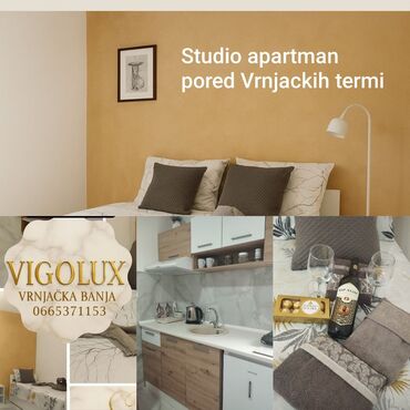 Udobno opremljen studio sa modernim ležajevima i dekorom, funkcionalnom kuhinjom (radna ploča, sudopera, kuvalo, elementi za odlaganje), stolom za obedovanje i osnovnim posuđem. Posteljina i peškiri uključeni. Svetao enterijer sa toplim tonovima i detaljima za prijatan boravak. Idealno za parove, porodice ili prijatelje koji žele smeštaj nadomak Vrnjačkih termi.