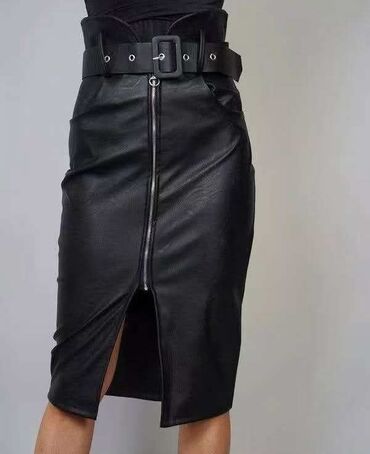 Ženska uska suknja od eko kože sa visokim strukom i dekorativnim pojasom. - Materijal: mekana eko koža sa blagim sjajem - Kroj: pencil/olovka, dužina do ispod kolena - Visoki struk sa formiranim k...