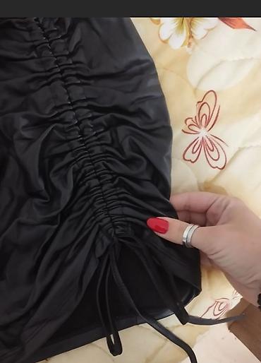 Crna mini suknja A‑kroja - Boja: crna - Kroj: A-line/raspoređena, visoki do srednji struk - Dužina: mini - Materijal: lagano teksturisan elasticni žersej koji lepo pada i ne providi se - Pojas: gl...