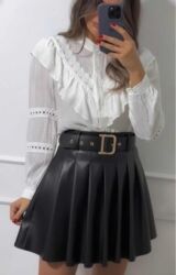 Ženska suknja – crna, midi dužina, visoki struk. Asimetrično preklapanje sa dekorativnim kontrastnim štepom u beloj boji. Prednje kopčanje na velike dugmiće po dijagonali. Istaknuti veliki karner/d...