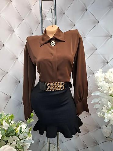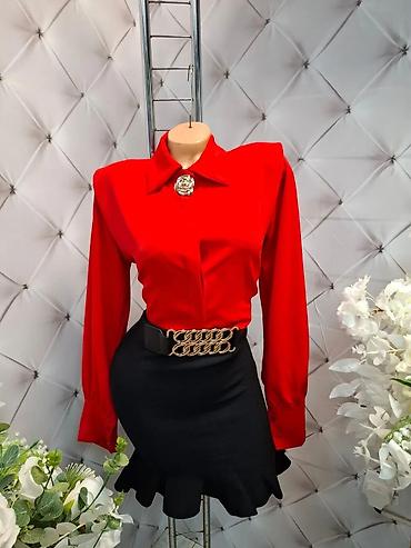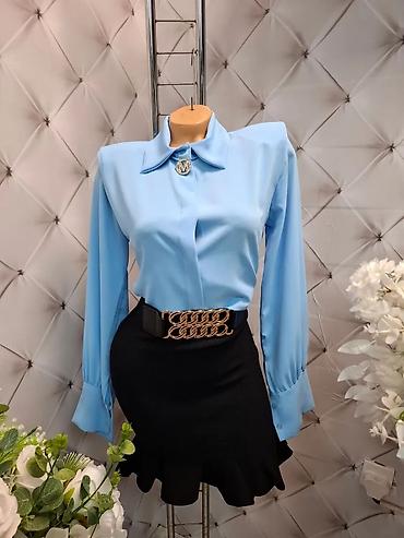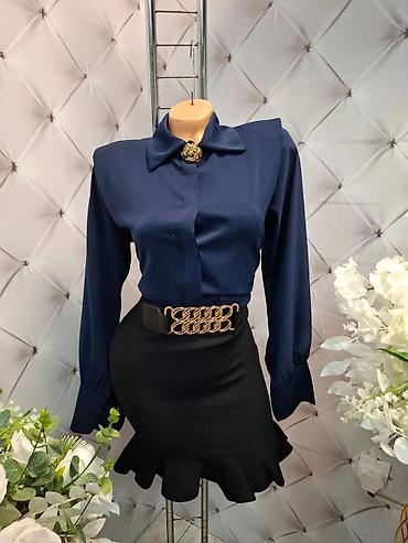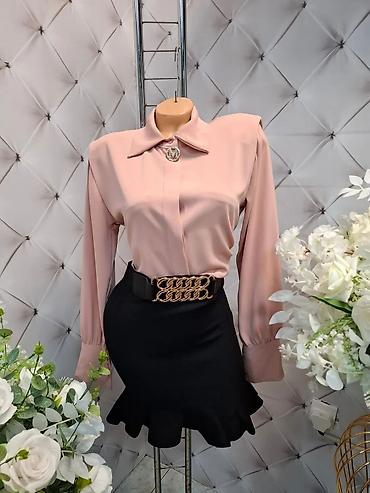 Elegantna ženska košulja sa dugim rukavima i skrivenom dugmad trakom, idealna za poslovne i večernje kombinacije. Istigsče se klasičnim kragnom i dekorativnom broš-kopčom na vratu. Rukavi su blago ...