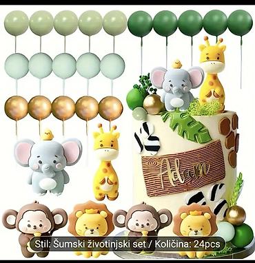 Komplet slatkih dekoracija za tortu sa motivima džungle. Idealno za dečije rođendane i tematske proslave.