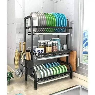 Sušač posuđa na tri nivoa, dizajniran za efikasno sušenje tanjira, činija i pribora za jelo. Izrađen od izdržljivog metala u crnoj boji, sa posudama za sakupljanje vode i bočnim nosačem za noževe, daske za sečenje i pribor. Dimenzije sušača su 61 cm visine, 42 cm dužine i 23.5 cm širine, što ga čini pogodnim za organizaciju kuhinjskog prostora. Idealan je za održavanje reda i higijene u kuhinji, omogućavajući brzo sušenje posuđa.