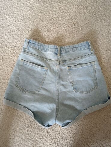 Ženske teksas šorts bermude sa „distressed“/pocepanim detaljima. Svetloplava isprana nijansa, visok ili srednji struk sa dugmetom i rajsferšlusom. Pet džepova (dva napred, mali novčani džep i dva p...
