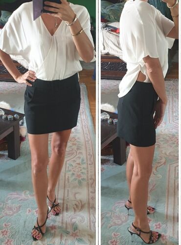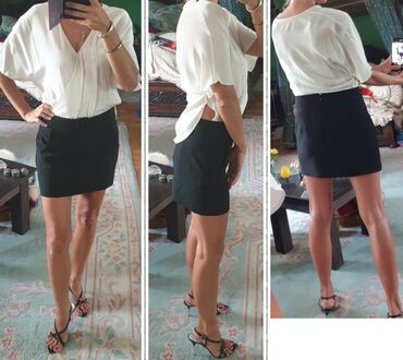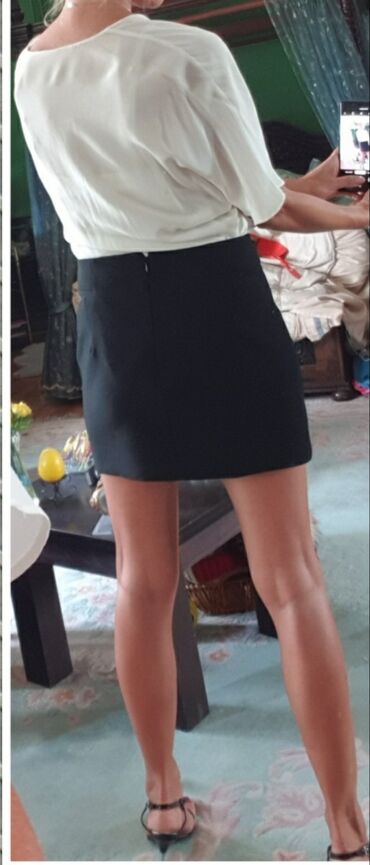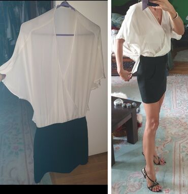 Svilena ZARA haljina, potpuno nova, velika mi je. Izgleda kao majica i suknja. Gornji deo bež boje je 100% svila, malo providan sto se i vidi, suknja je crna i viskoza. Pozadi se taj gornji deo, moze uvuci u suknju ili pustiti preko.