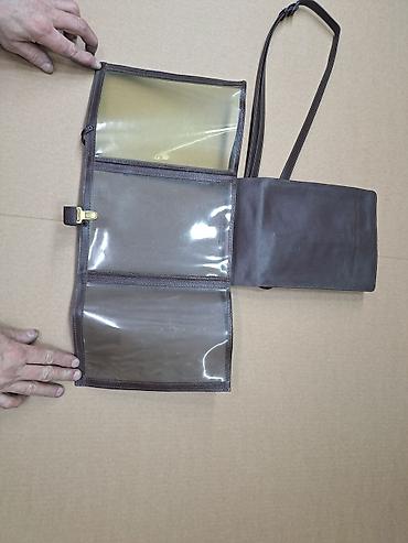 - Materijal: prirodna koža sa teksturom; unutrašnji delovi kombinovani sa glatkom kožom i providnim PVC pregradama
