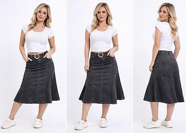 Crna teksas midi suknja A-kroja - Materijal: mekani, blago elastični denim za udobno pristajanje i lako kretanje - Dužina: midi – do ispod kolena - Kroj: blago sužena preko kukova sa širim, leprša...