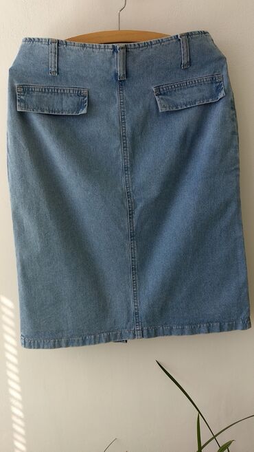 Suknja visokog struka, veličina M, senf/okergalna boja. Model ravnog kroja do iznad kolena, sa nabranim pojasom i dekorativnim kaišem/vezicom koja se zateže napred. Ima diskretne faltice ispod poja...