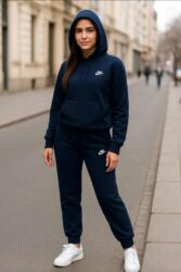 Ženski komplet trenerke – duks s kapuljačom i donji deo - Model: dvoslojni duks sa kapuljačom i učkama + trenerka sa elastičnim pojasom i učkurom - Kroj: komforan, sportsko‑casual; donji deo sa ra...