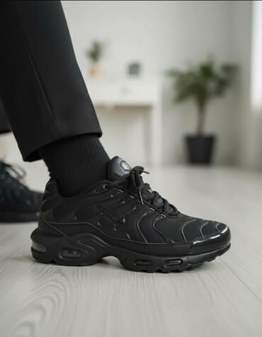 Nike Air Max Plus (TN) patike - Gornjište: mrežasta i sintetička tkanina sa talasastim TPU “kavezom” za strukturu i stabilnost - Boja: siva sa crnim detaljima, plavi Swoosh i akcenti u nijansama p...