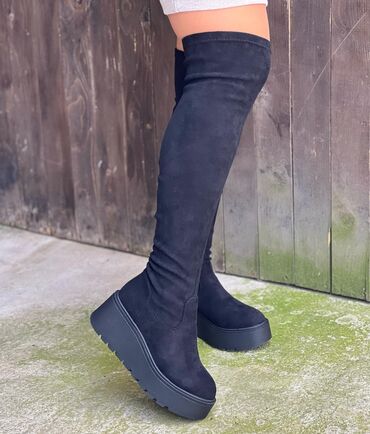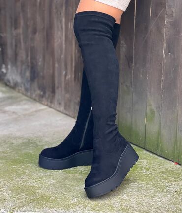 Ženske čizme preko kolena, crne, od mekane velur/brušene tkanine. Model sa skrivenom platformom i punom petom sa blago zaobljenim vrhom. 38 veličina