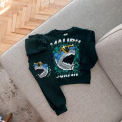 Zara Kids dukserica sa kapuljačom za decu, veličina 9–10 godina (visina 140 cm). Boja: teget/plava sa zelenim printom napred. Model sa dugim rukavima, rebrastim ranflama na rukavima i donjem rubu. ...