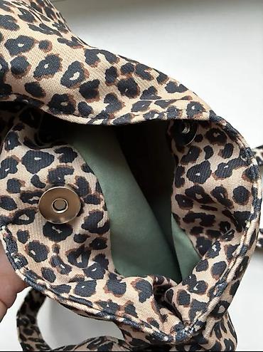 - Dizajn: srcolika crossbody/ramena torba sa upečatljivim leopard uzorkom. Na prednjoj strani diskretan crveni detalj/etiketa.