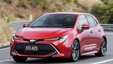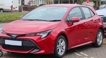 Crveni automobil marke Toyota, model Corolla, tip hečbek. Vozilo ima moderan dizajn prednjeg dela sa istaknutom maskom hladnjaka i oštrim farovima. Opremljen je felnama od lake legure i hibridnim p...