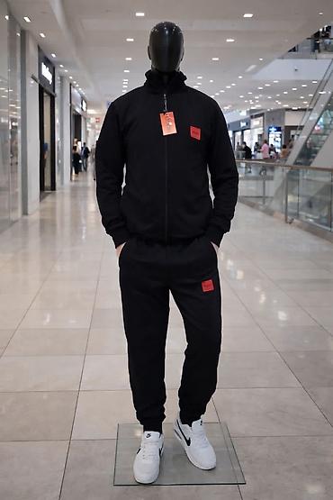Muške trenerke – komplet gornji deo i donji deo sa rajsferšlusom i elastičnim strukom. Modeli sa modernim logotipovima (Hugo, Polo Ralph Lauren, EA7, Jordan), crna ili kombinacija crvene jakne i crnih pantalona.