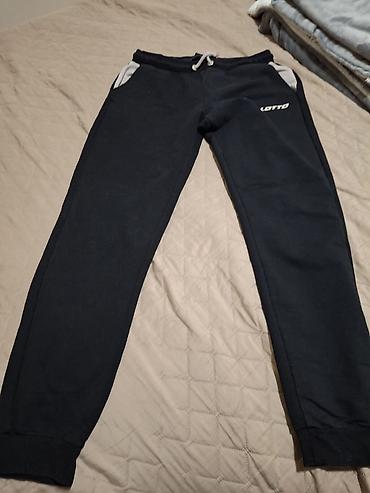 Napomena: na fotografijama su i druge crne pantalone kožnog izgleda, ali oglas se odnosi na Lotto pamučne trenerke sa logom i etiketa prikazana u krupnom kadru.