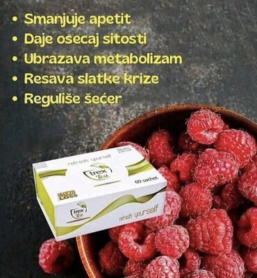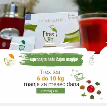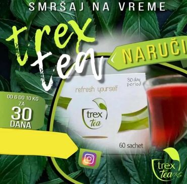 Trex Tea čaj za mršavljenje je prirodni dodatak ishrani dizajniran za podršku procesu smanjenja telesne težine. Pakovanje je predviđeno za tridesetodnevnu upotrebu i sadrži 60 kesica, sa preporukom konzumacije dve kesice dnevno. Ovaj čaj može pomoći u postizanju željene figure. Proizvod je formulisan da se uklopi u svakodnevnu rutinu i pruži podršku tokom mršavljenja. Priložena slika prikazuje pakovanje sa tekstom „refresh yourself“ i „30 day period“, što naglašava njegovu funkciju za osveženje i periodičnu primenu. Idealan je za one koji traže prirodan način za podršku u regulaciji telesne težine.