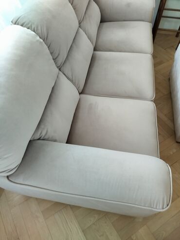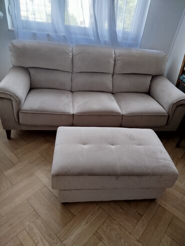 - Elegantna, moderna garnitura: trosed sa visokim naslonom i širokim naslonima za ruke, uz odgovarajući tabure pravougaonog oblika.