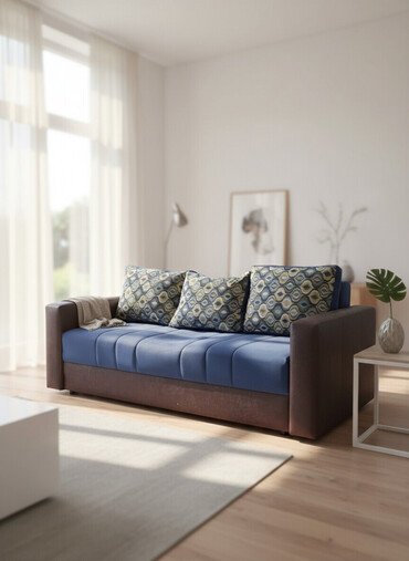 - Jastuci: tri velika, odvojiva naslonska jastuka sa šarenim geometrijskim dezenom (plavo–bež–maslinasto)