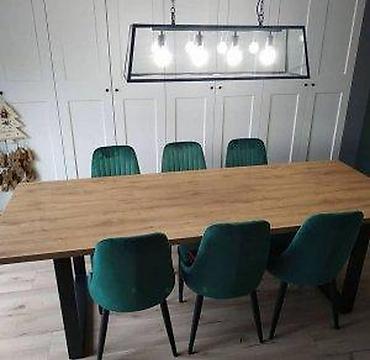 Trpezarijski set – sto sa četiri stolice - Sto: ovalni/višestrano zaobljen, drvena ploča sa izraženom teksturom drveta i profilisanim ivicama. Stabilna baza sa centralnim postoljem i dodatnim oslo...
