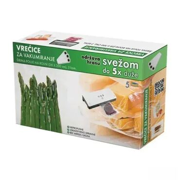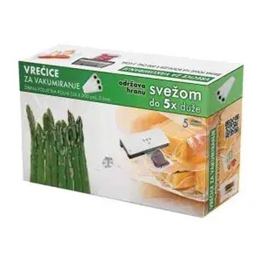 U ponudi imamo i sledeće kese : Reljefne kese za vakumiranje 150mm x 250mm 100 kom = 1.000, oo Reljefne kese za vakumiranje 200mm x 300mm 100 kom = 1.300, oo Reljefne kese za vakumiranje 250mm x 300mm 100 kom = 1.800, oo Reljefne kese za vakumiranje 150mm x 250mm 50 kom = 500, oo Reljefne kese za vakumiranje 200mm x 300mm 50 kom = 650, oo Reljefne kese za vakumiranje 250mm x 300mm 50 kom = 900, oo Reljefne kese za vakumiranje 120mm x 550mm 50 kom = 1.050, oo Reljafna kesa za Vakumiranje 200mm x 15 m Rolna = 1.090, oo Reljafna kesa za Vakumiranje 250mm x 12 m Rolna = 1.090, ooReljafna kesa za Vakumiranje 280mm x 9 m Rolna = 1.090, oo Opis : širina (mm) dužina (mm) debljina (µ ) komada u paketu vrsta paketa 200x300 105 50kom kutija Vakum kese i vrećice za domaćinstvo Vakum kese i vrećice imaju široku primenu kod pakovanja mesa i mesnih prerađevina, sira i mlečnih proizvoda, ribe i morskih plodova, pekarskih proizvoda, testenina, zrnastih i praškastih proizvoda. Barijerne folije se proizvode procesom koekstruzije različitih polimera. U zavisnosti od proizvoda koji se pakuje i vrste barijere koriste se različite kombinacije materijala kao što su PA, EVOH, PP i sl. Ovaj tip folija je po prirodi višeslojan. Informacije Tehnoprometst jeregistrovana je za prodaju robe. Sva poručena roba je nova i u orginal ambalaži sa garancijom i fiskalnim računom. Kliknite na KP izlog i pogledajte našu kompetnu ponudu. . . Moguće je i lično preuzimanje kod nas u. Tehnopromet st DOO Novosadska 190/1 21235 Temerin021/846-162 Radno vreme Pon-Pet. : 08-19hSubota : 08-13hNedelja : Ne radi