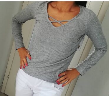 Siva ženska majica dugih rukava - Materijal: meka, rebrasta rastegljiva tkanina za udobno prijanjanje. - Kroj: blago strukiran, dužina preko kukova. - Izrez: V-izrez sa dekorativnim ukrštenim trak...