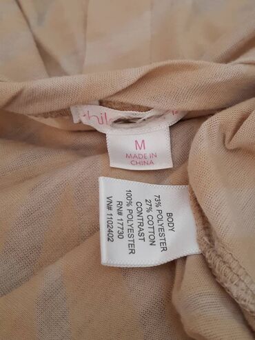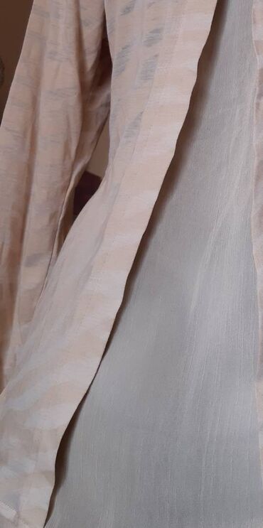 - Materijal: lagana, prozračna tkanina sa diskretnim zebraste/valovite šare; donji rub sa providnim, šifonastim slojem koji daje efekat dvostrukog poruba.