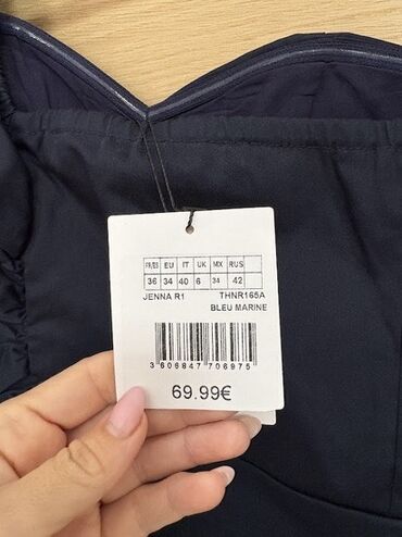 Boja: tamno plava. Dizajn ističe figuru i daje moderan, sofisticiran izgled. Tag je vidljiv na jednoj od fotografija.