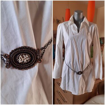 Perrywhite bela košulja-tunika sa dugim rukavima i kragnom, asimetričnog preklopa napred. U kompletu dolazi ukrasni lančani kaiš sa ovalnom kopčom ukrašenom perlicama. Dužina do sredine butine, blago strukirana linija.