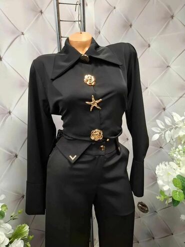 - Gornji deo: crna košulja dugih rukava sa širokim kragnom. Prednjica ukrašena dekorativnim zlatnim elementima – kružni dugme na kragni, reljefna ruža na grudima, zlatna morska zvezda na sredini i ruža u struku. Na manžetnama istaknuti ukrasni dugmi u zlatnom tonu.