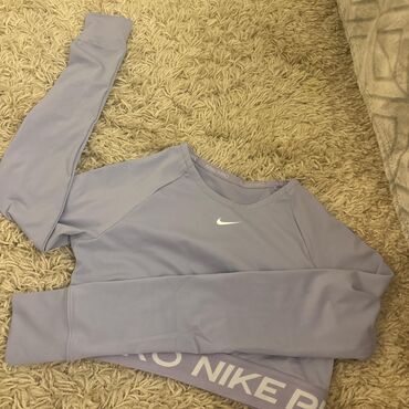 - Gornji deo: dug rukav, kraći kroj (crop), okrugli izrez; napred mali Nike Swoosh. Elastična traka ispod grudi sa velikim NIKE PRO natpisom obezbeđuje stabilnost tokom vežbanja.