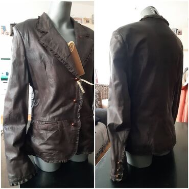 - Detalji: diskretne falte/volančići duž revera i iznad džepova; ukrasna dugmad u braon boji na kopčanju i na rukavima