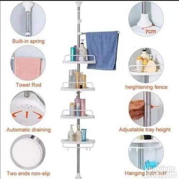 Rešenje za skladištenje koje štedi prostor. -Viseći stub, okačite peškir za lice i ogrtač itd. -Gornji stub sa ugrađenom oprugom koja obezbeđuje zatezanje potrebno za držanje stuba na mestu.