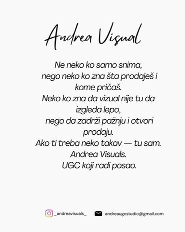 Ako ti treba neko ko ne “samo snima”, već zna šta prodaješ i kome pričaš — Andrea Visuals kreira UGC koji radi posao.