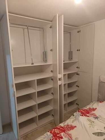 Trodeleni garderober od univera u dekoru svetlog hrasta, sa centralnim ogledalom. - Dimenzije: približno širina 180–200 cm, visina oko 200 cm, dubina oko 50–55 cm (vizuelna procena). - Raspored: ...