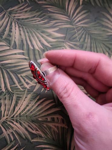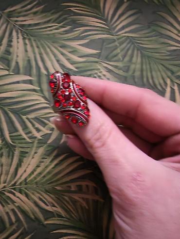 Ukrasni prsten sa crvenim kamenčićima - Dugačak, izdužen dizajn koji