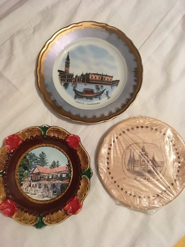 2. Dva ukrasna zidna tanjira, oba kupljena u Sokobanji. Veći je fi 21,5cm i prikazuje tvrđavu Sokograd, a manji je fi 14cm i prikazuje Milošev konak. Oba su reljefna i stara oko 40 godina, 1000din.