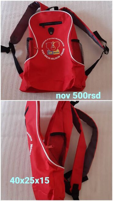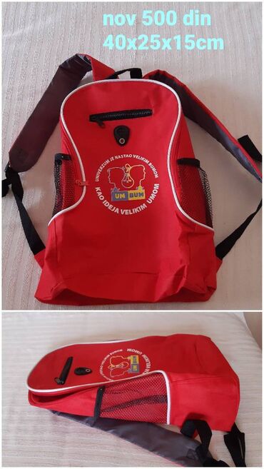 Crveni ranac “UM BUM” sa štampom na prednjoj strani.
