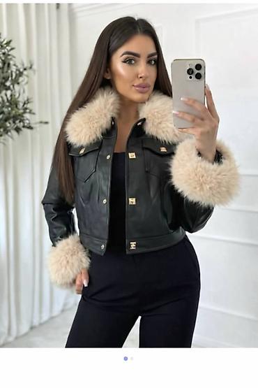 Elegantna ženska kratka jakna od crne eko kože sa bogatim krznenim detaljima. - Materijal: glatka eko koža, mekano krzno u svetlo bež nijansi na kragni i manžetnama - Kroj: strukirani, kraći mode...