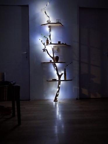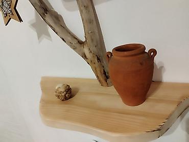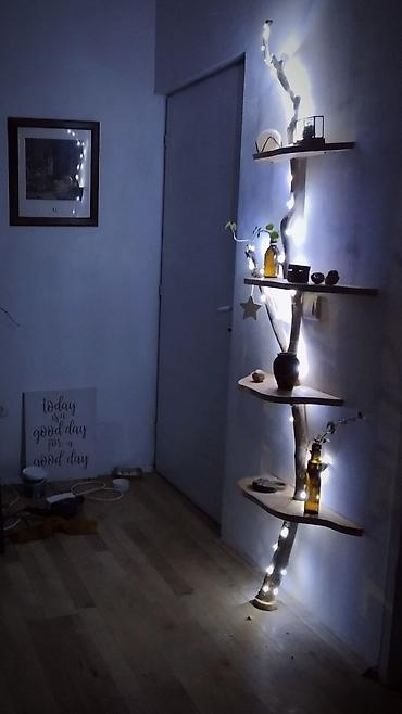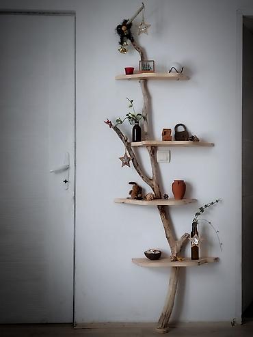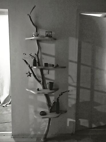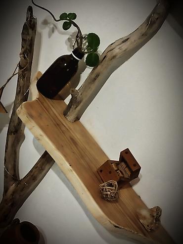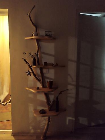 - Ručno rađena unilatna dekorativna polica u obliku stabla: centralni deo „stablo” je od prirodne grane, sa 4 postavljenih polica od punog borovog drveta.