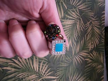 - Gornji elementi izdignuti, približno slične širine kao alka; jedan okrugao sa štrasom u boji, drugi geometrijski sa tirkiz detaljem.